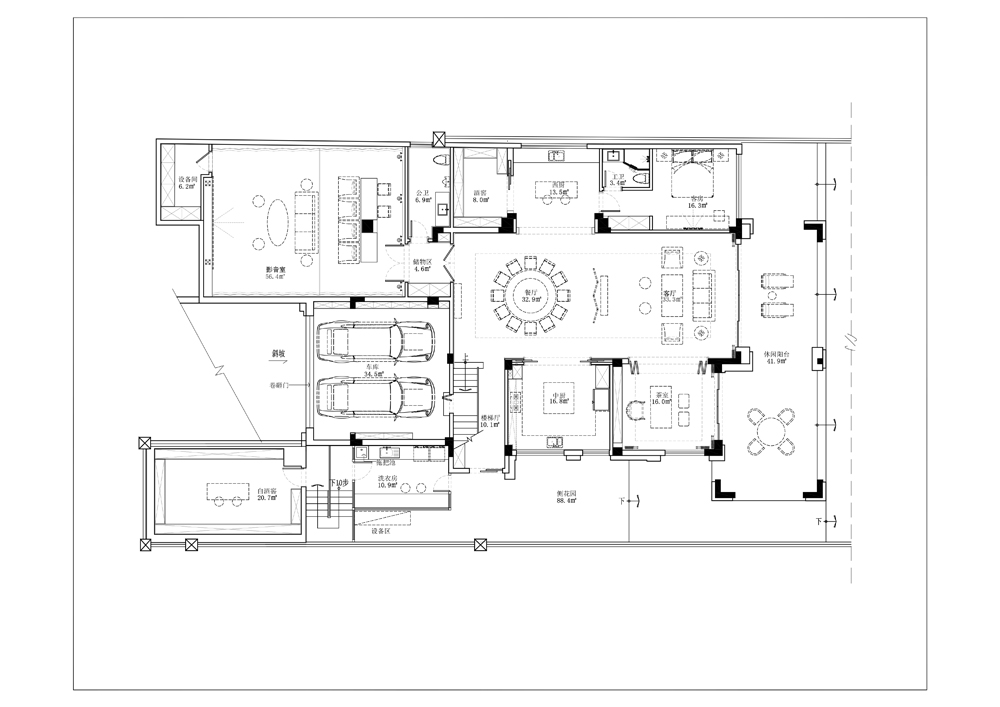 負一層的影音室營構了一個家人互動的休閑場景,智能化影音設備在有限的空間里提供了無盡的想象,通過豐富多彩的感官體驗令情緒得到放松。
