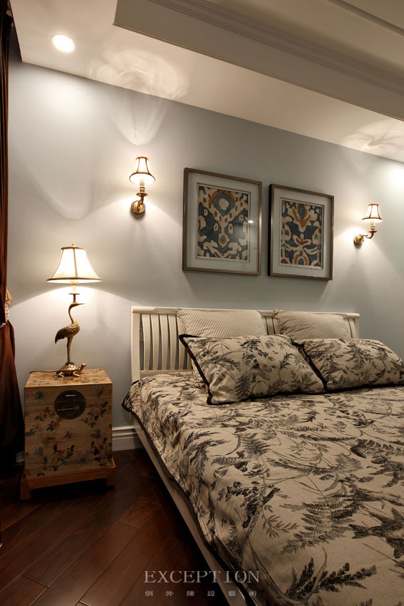 一片梨白的淡雅框定出印花墻紙的深沉格調,灰藍色的花紋與孔雀壁畫一同,驕傲的炫耀著專屬它的雅致。