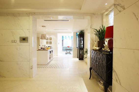 玄關設計承接房子的整體色調,以白色為主,黑色的裝飾柜不失為濃墨重彩的一筆,醉是那柜臺上那一抹嫣紅,和著旁邊的綠色植物以及陶瓷鵝,厚重中迸發出活力。從玄關到客廳,雪花白大理石臺階過度自然,將兩個空間恰似無意地銜接在一起,增加了空間上的延續。