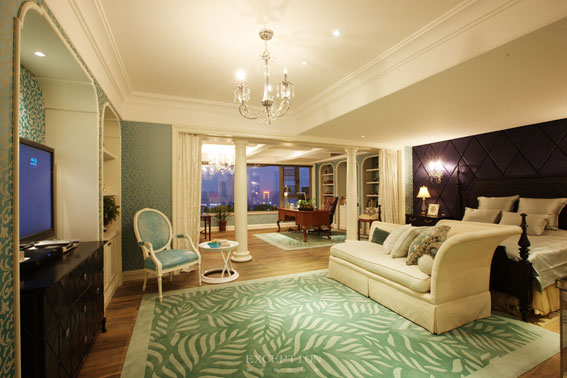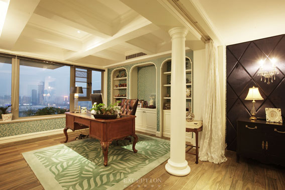 主臥書房天花的大方格設計彰顯大氣,翠綠的壁柜與地毯又透出淡雅的清新,羅馬大柱形成的開放卻隔斷格局,增加了層次感。