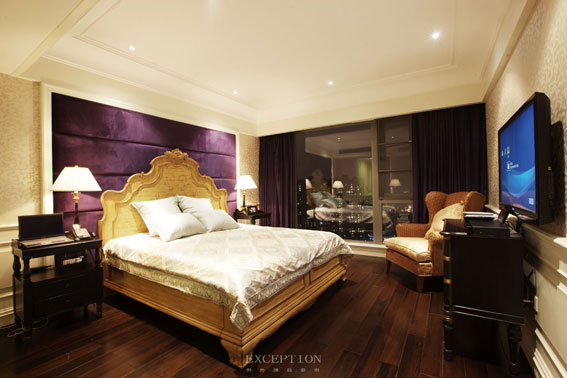 父母房的設計脫離了淺色的輕盈,少量的裝飾物更重視生活的實質需要,表現穩重的特性。而床頭的紫色絨布軟包則散發出一種高貴之氣,典雅之余,怡神靜氣。
