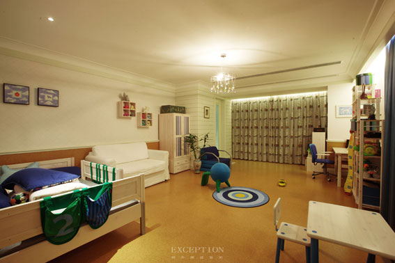 簡單、整體上色調一致,稀稀疏疏地點綴著些許綠色,藍色,活躍了整個房間的的氣氛。木紋感十足的小桌椅,還有各式各樣的玩具。足已勾起了記憶深處童年的回憶。值得一提的是,這里選用的是軟木地板,這樣小孩踩上去軟軟和和的,即使摔倒也不用擔心會磕到,碰到。處處留心皆學問。