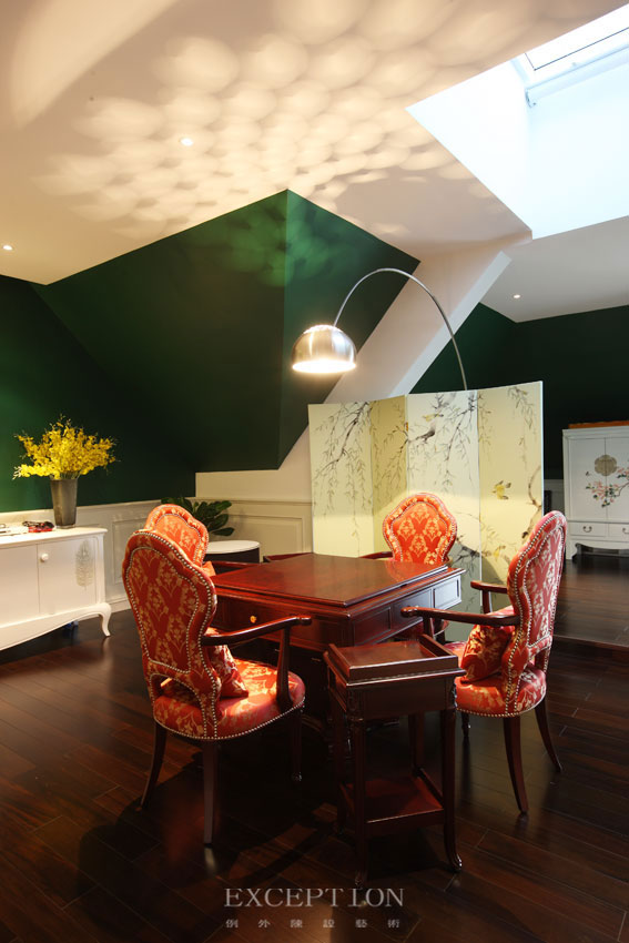 棋牌室的設計完全顛覆了傳統意義上的簡歐風格,顏色選用夸張大膽,深綠色涂料在室內設計中的運用是一種突破。中式屏風里蘊含的那一派鳥語花香,為沉穩的氣氛營造了躍動感,幽幽古韻,淡雅脫俗。一盞釣魚燈剛好垂照在麻將桌上,更有俏皮的燈光穿過燈罩上的小孔射在天花板上,造成水光粼粼的境象,整個空間美輪美奐。
