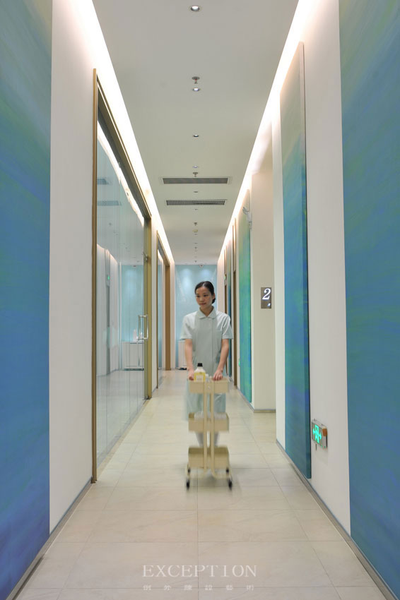 有人说,美,是寻找一种平和。对称设立的隐藏光带实是设计师在空间中不断探讨的平衡法则,以此传递出沉静稳妥的安全之感。单调的白色墙壁未免过于冷清惨淡,于是巧用硬包版画进行装饰,当温润的蓝漫延过整条走廊,仿佛渐变的天空般澄澈爽朗。